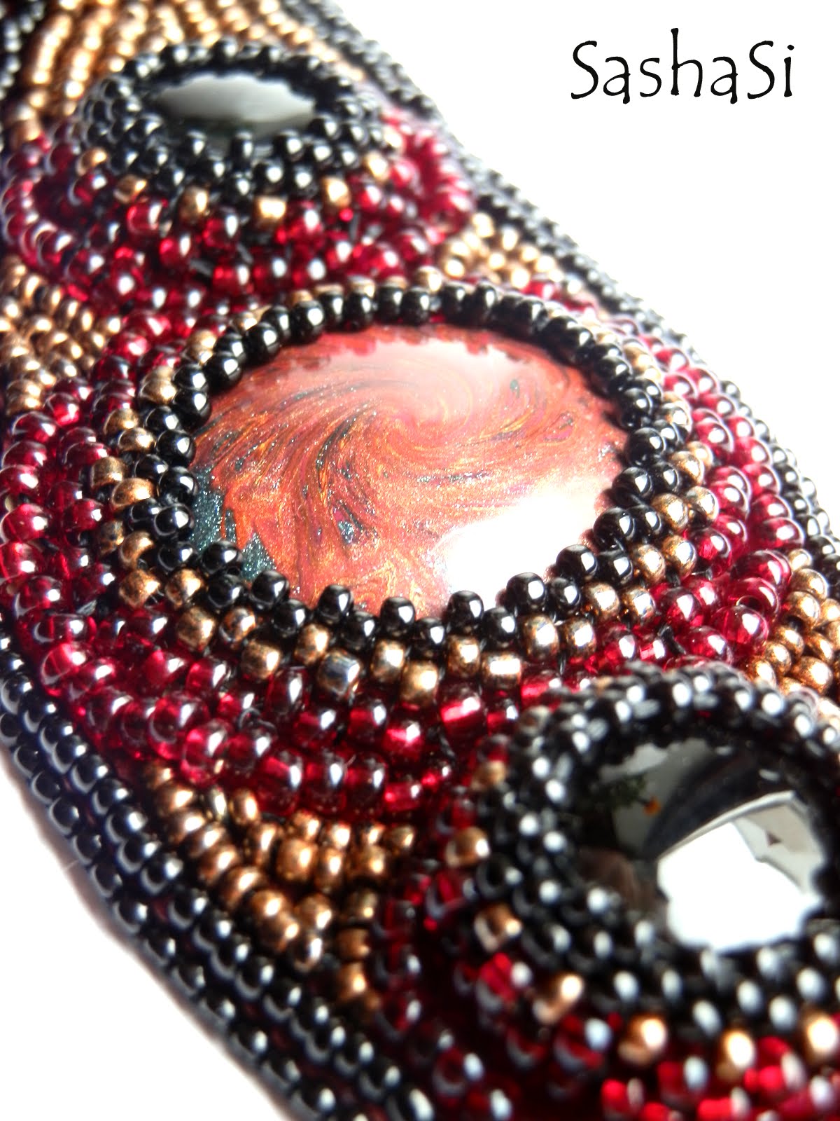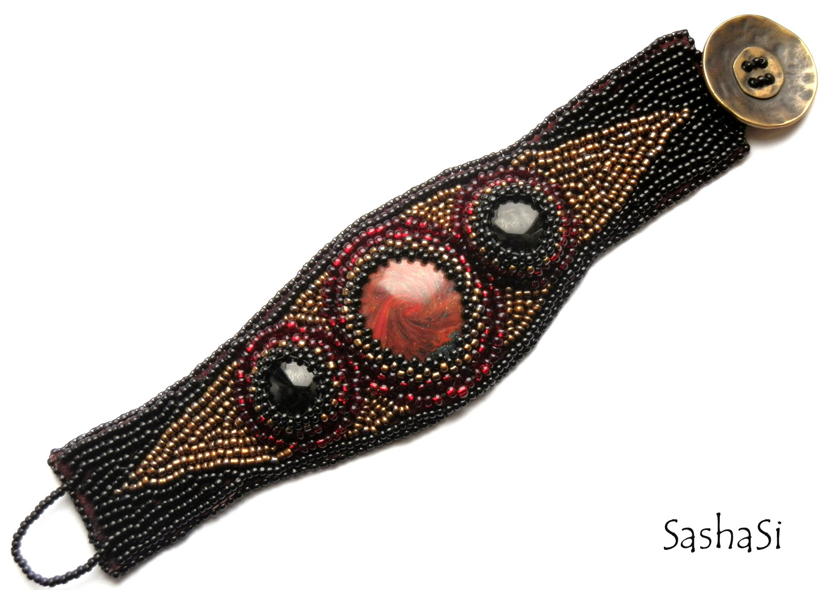The bead embroidered cuff on genuine leather, with black glass cabochons and my hanmade polymer clay cabochon in the centre. I´ve been delaying and thinking over and over about how to make a clasp, untill I saw this metal button in Hickeys.
