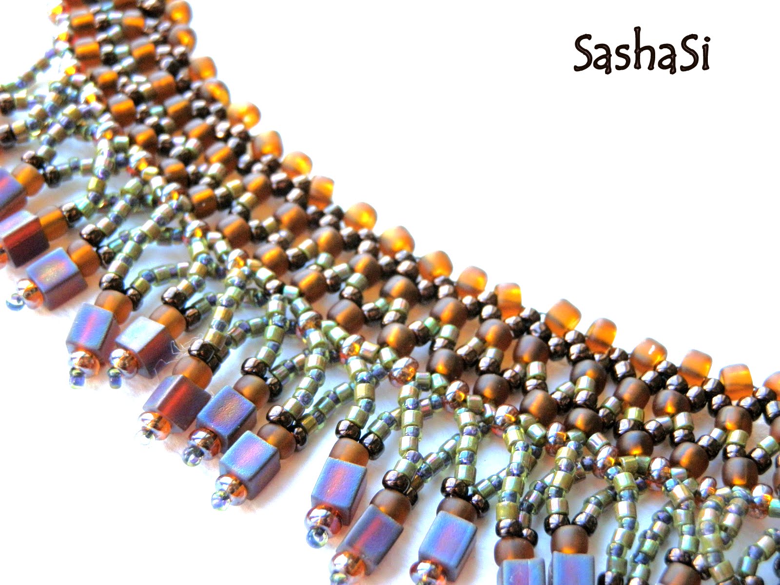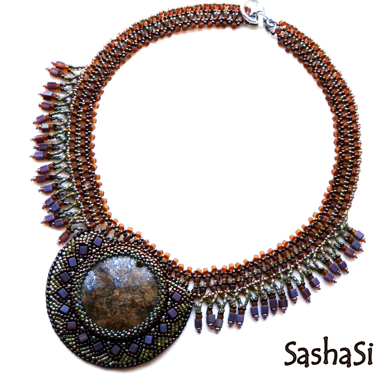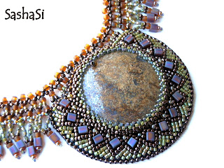 Ancient Romans believed this stone would protect them from mental confusion. I guess we can trust them. This collar combines two beading techniques - bead embroidery and bead weaving. The backing of the embroidered part is genuine leather.