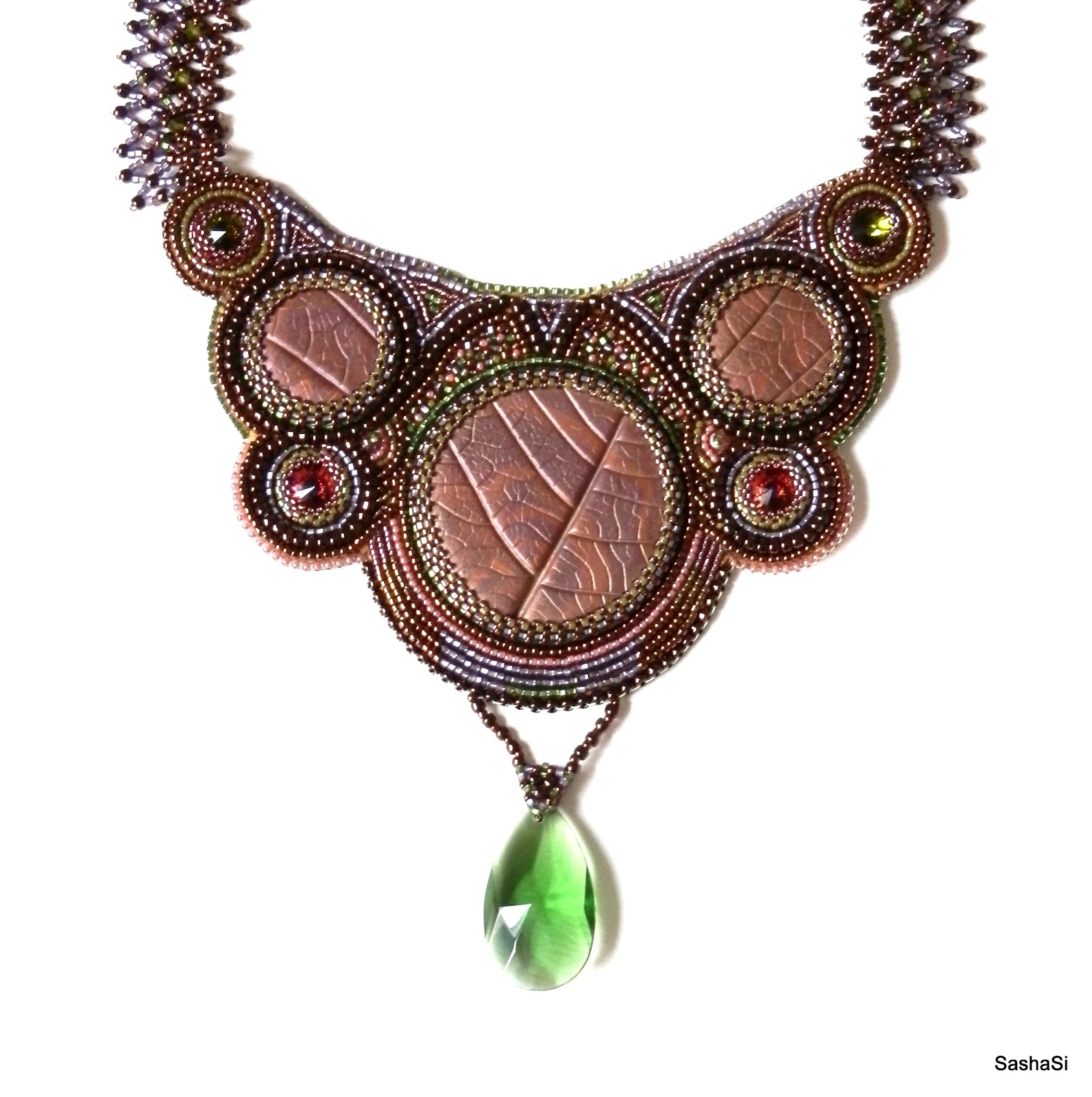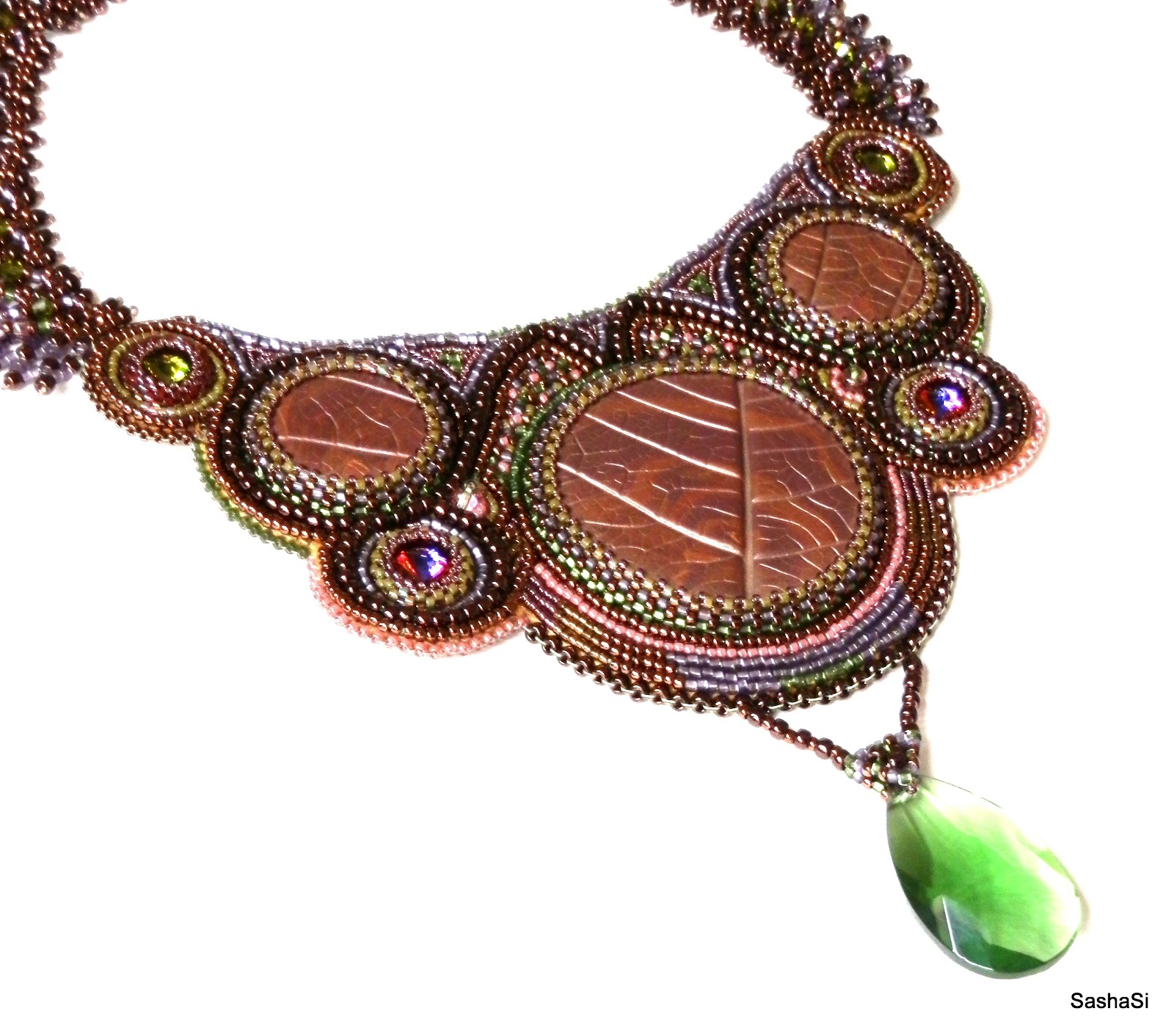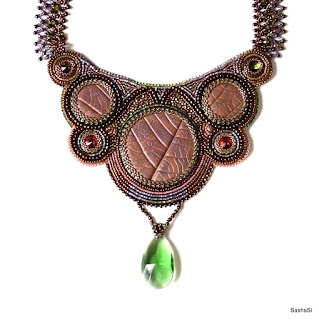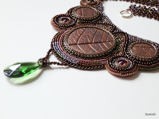 This necklace was created for the April 2013 Etsy Beadweavers beading challenge, the theme of this challenge is "Shades of Scheherazade”.The front of this necklace is bead embroidery. I made the polymer clay cabochons myself. I also used Swarovski crystals, Japanese seed beads and genuine leather backing. The straps are beadwoven with lots of Swarovski crystals.